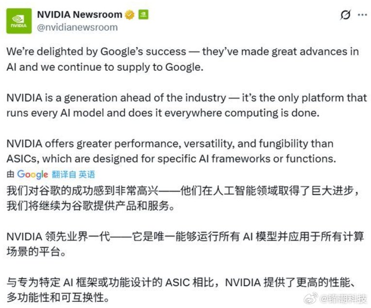 英伟达回应谷歌AI进展,称仍领先业界一代